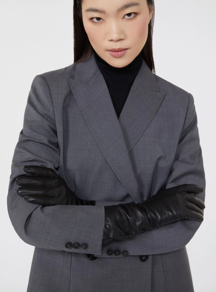 An elegant cold-weather essential. Crafted from supple lambskin nappa leather, these medium-length gloves by Weekend Max Mara combine luxurious texture with timeless design. Finished with a soft wool lining and a discreet metal butterfly logo, they bring understated sophistication to any look.