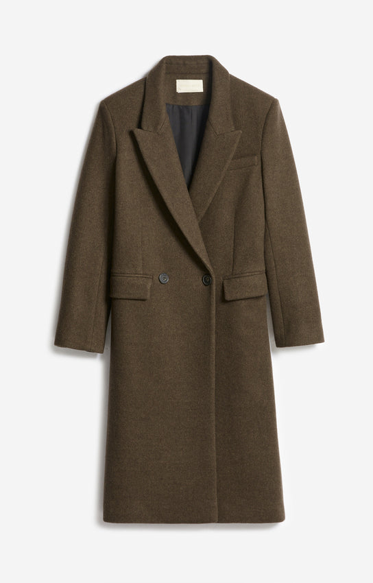 A modern interpretation of classic tailoring. The Faloua Coat by Vanessa Bruno is crafted from textured wool cloth, offering a structured yet feminine silhouette. With its double-breasted crossover, tailored collar, and mid-length cut, it embodies timeless sophistication and enduring versatility.