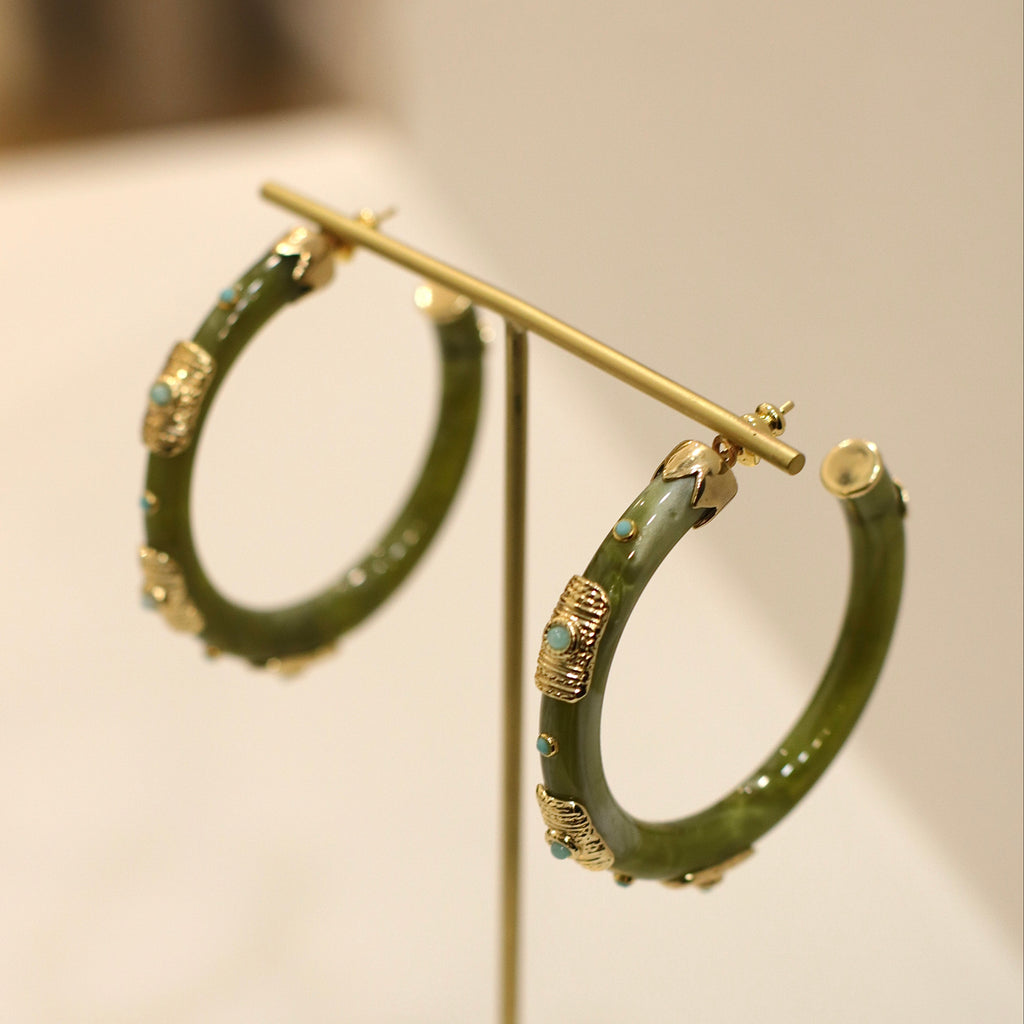 Artistic, vibrant and unmistakably Gas Bijoux, the Caftan Meknes earrings offer a refined statement with their glossy enamel finish and intricate gold detailing. The olive-green hoop is accented with delicate turquoise touches, bringing a subtle hint of colour that feels both luxurious and effortless.