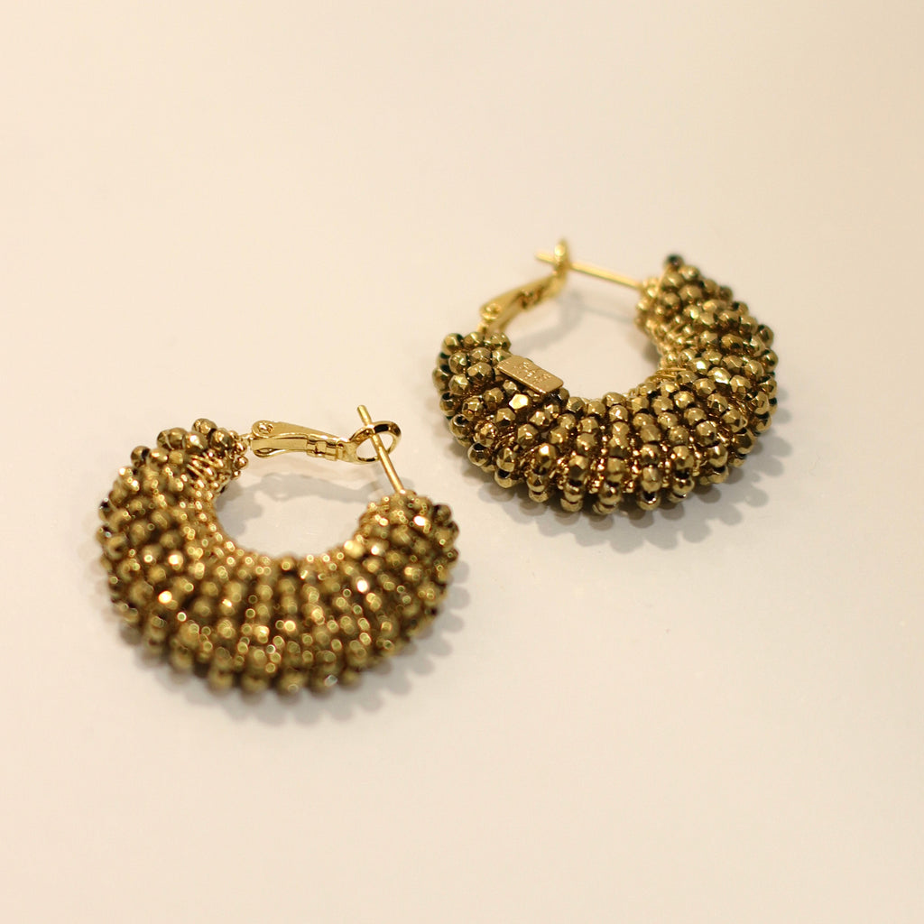 A signature Gas Bijoux design, the Bo Izzia earrings bring texture, artistry and effortless French glamour to every look. Hand-crafted in Marseille, each hoop is formed from clusters of gleaming gold-tone beads, creating a sculptural silhouette that feels both timeless and modern. Lightweight yet statement-making — the perfect finishing touch from day to evening.