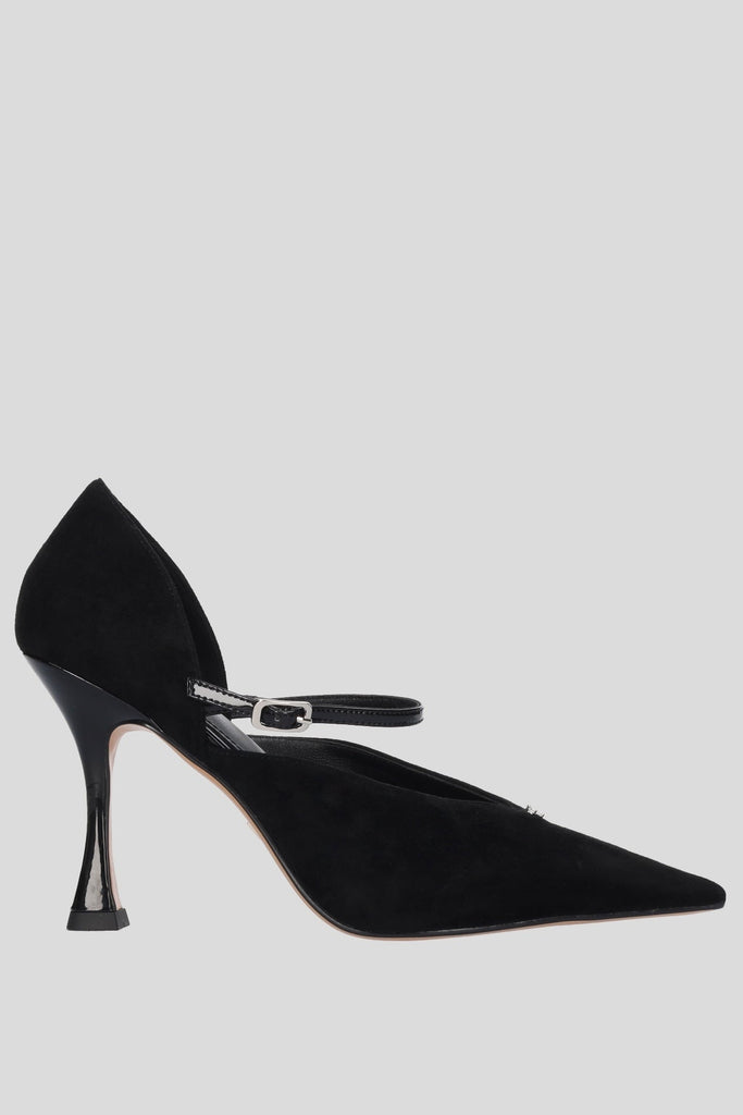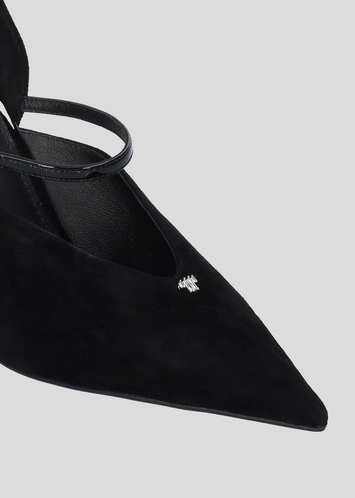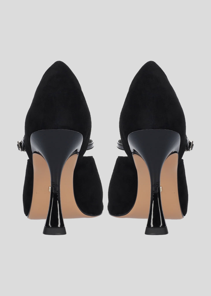 Elegant evening shoe with fluted heel and cross-over strap in black suede with diamanté detail.