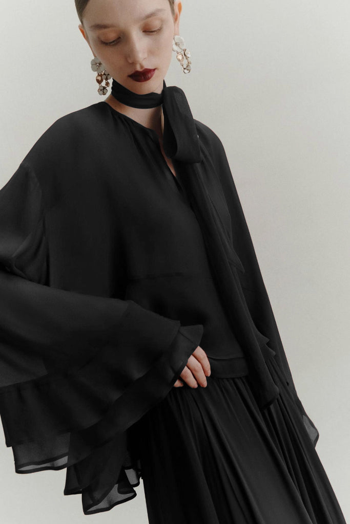 The Prisca blouse is a feminine piece with elegant detailing, crafted from lightweight viscose georgette. Designed with a round neckline and teardrop fastening, it features a collar strap that ties for added versatility. The asymmetric hem with double flounce and ruffled cuffs brings movement and charm, making it perfect for both everyday styling and dressier occasions.