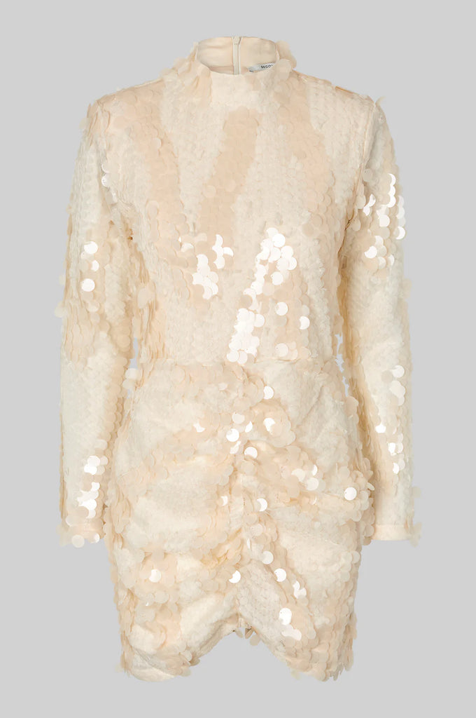 Second Female sequin dress. The dress combines sparkly sequins and sheer 3D fabric on a tonal mesh background. Featuring a high neck and zip fastening at the back. Gathered seam at front. Shoulder pads and long sleeves. Lined body. Slim fit.