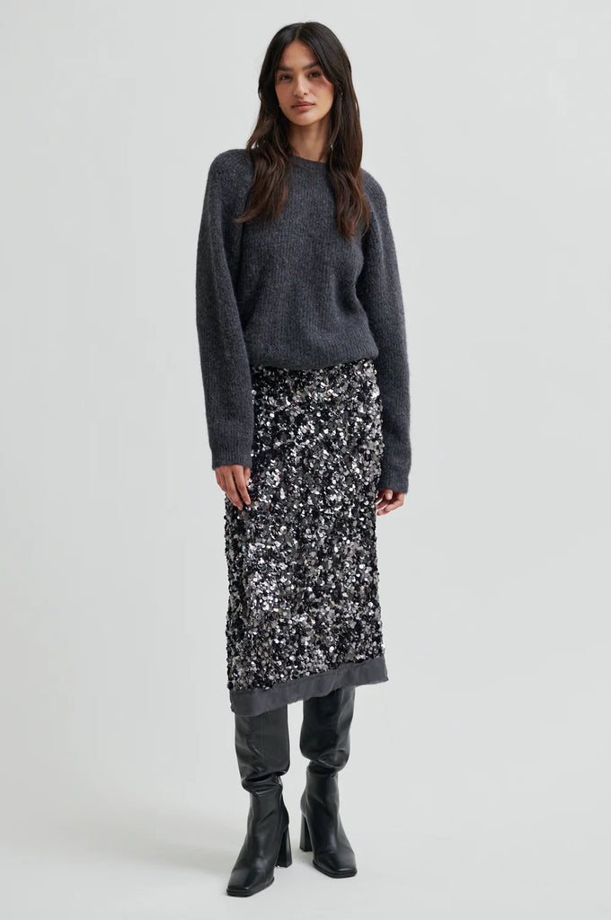 Effortlessly chic and eye-catching, the Shiny Midi Skirt from Second Female is designed to shimmer with every step. Covered in sequins in a soft 'Tofu' shade, this piece brings modern glamour to your wardrobe while remaining versatile and easy to...