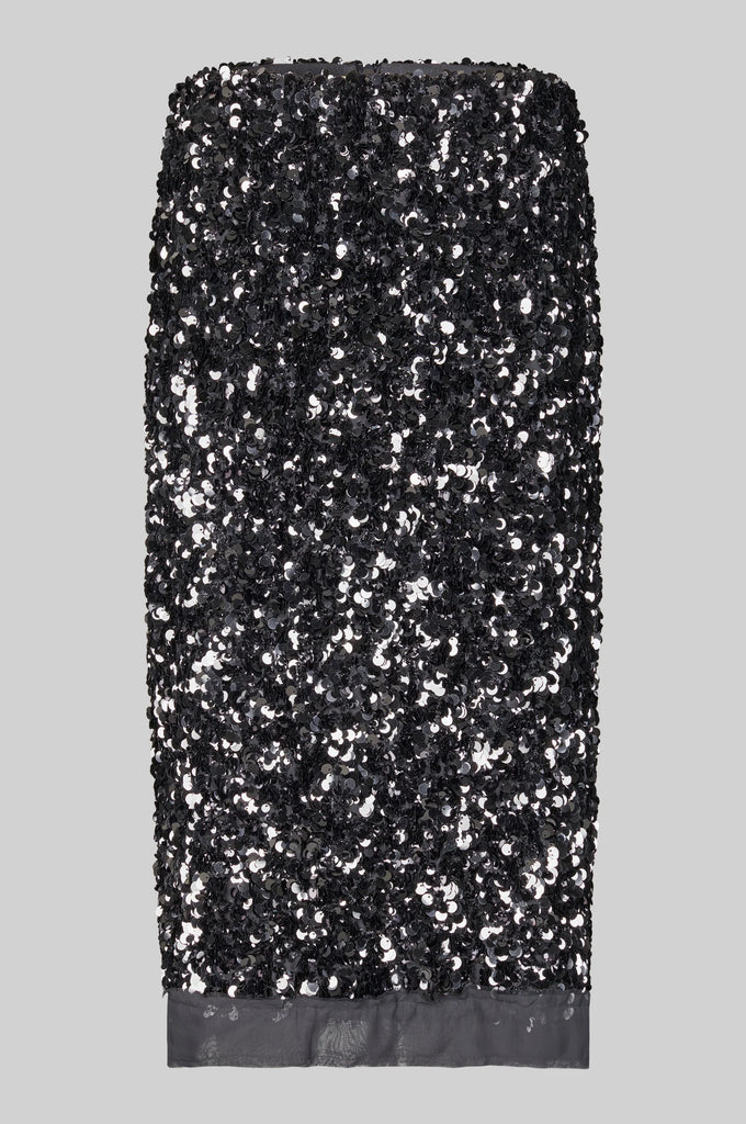 Second Female sequin pencil skirt. The skirt features different-sized sequins on a tonal background and a covered elasticated waistband. Visible lining at hem. Slit at one side. Fully lined. Slim, straight fit.