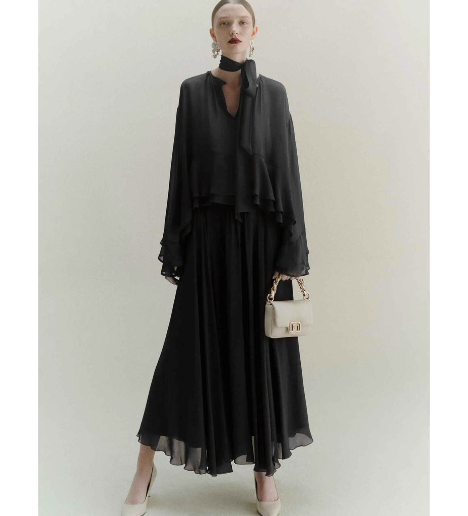 The Prisca blouse is a feminine piece with elegant detailing, crafted from lightweight viscose georgette. Designed with a round neckline and teardrop fastening, it features a collar strap that ties for added versatility. The asymmetric hem with double flounce and ruffled cuffs brings movement and charm, making it perfect for both everyday styling and dressier occasions.