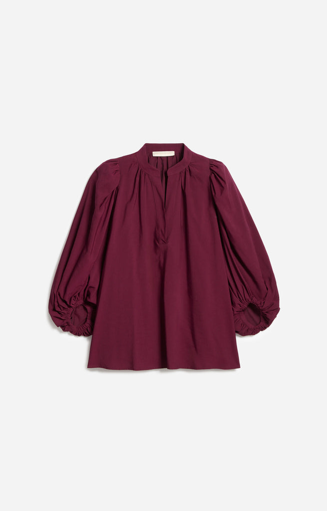 Feminine yet striking, the Bell blouse from Vanessa Bruno is defined by its voluminous silhouette and fluid drape. Crafted in a rich wine hue, it features a soft Tunisian neckline, gathered detailing, and statement puff sleeves with gently tightened cuffs for a romantic finish.