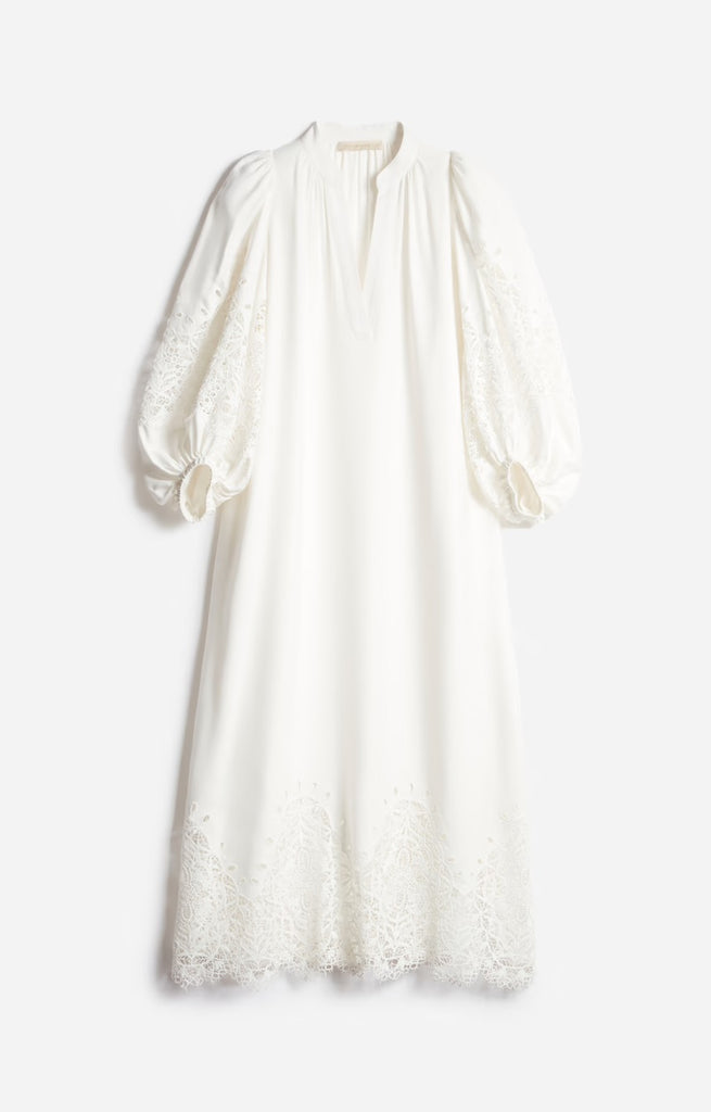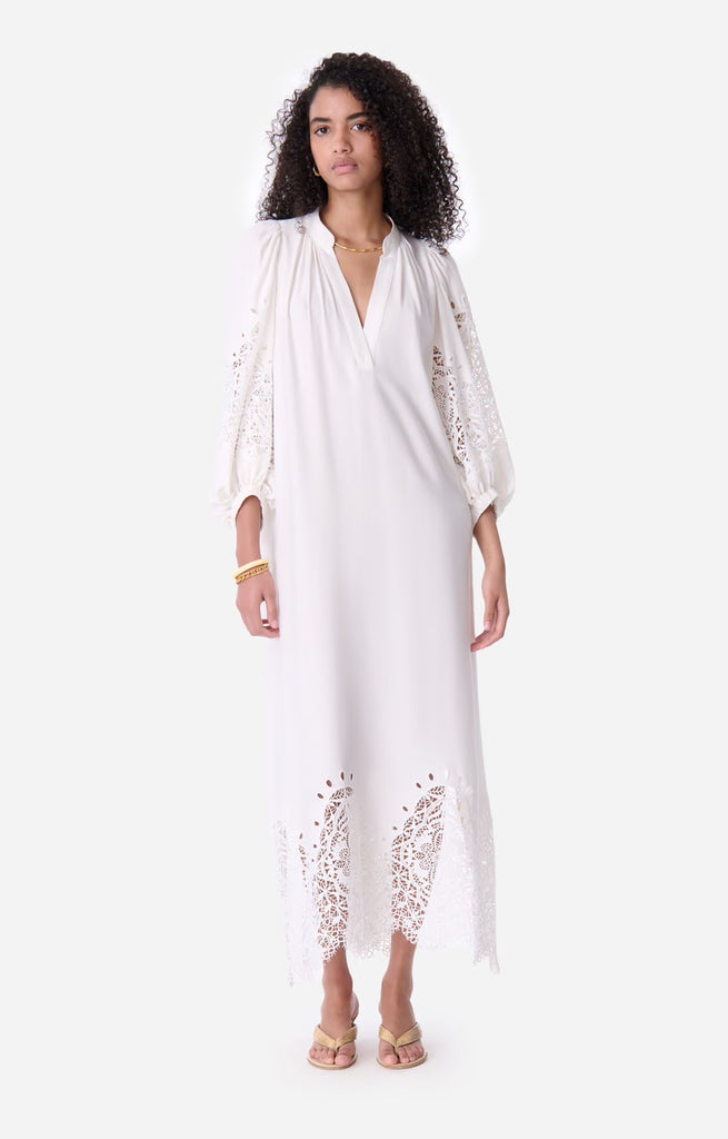 An embodiment of effortless elegance, the Canessa Dress by Vanessa Bruno is a timeless piece designed for refined femininity. Crafted from a soft viscose blend, it drapes beautifully, offering a relaxed yet sophisticated silhouette. The delicate lace inserts on the balloon sleeves and hemline add a romantic touch, while the subtle V-neckline enhances its fluid design. Perfect for warm-weather occasions, style it with minimalist gold jewellery and strappy sandals for an ethereal, bohemian-inspired look.