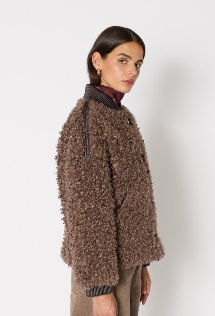 Retro-inspired and ultra-cosy, the Gilian Coat from Berenice is crafted from soft bouclé faux fur for a textured, cocooning feel. Designed in a short, loose silhouette with contrasting faux leather trims, it balances structure and comfort for a modern, elevated finish. Perfect for adding warmth and style to winter looks.