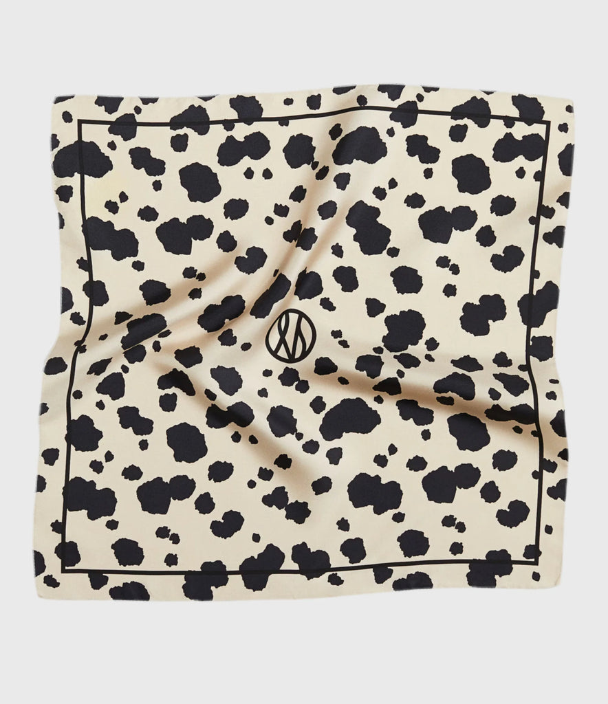 A playful yet polished addition to your accessories collection. The dalmatian Silk Scarf features a bold sand-and-black spotted print, crafted from 100% silk for a smooth, lightweight finish. Perfect for tying around the neck, styling in the hair, or adding a chic accent to your handbag.