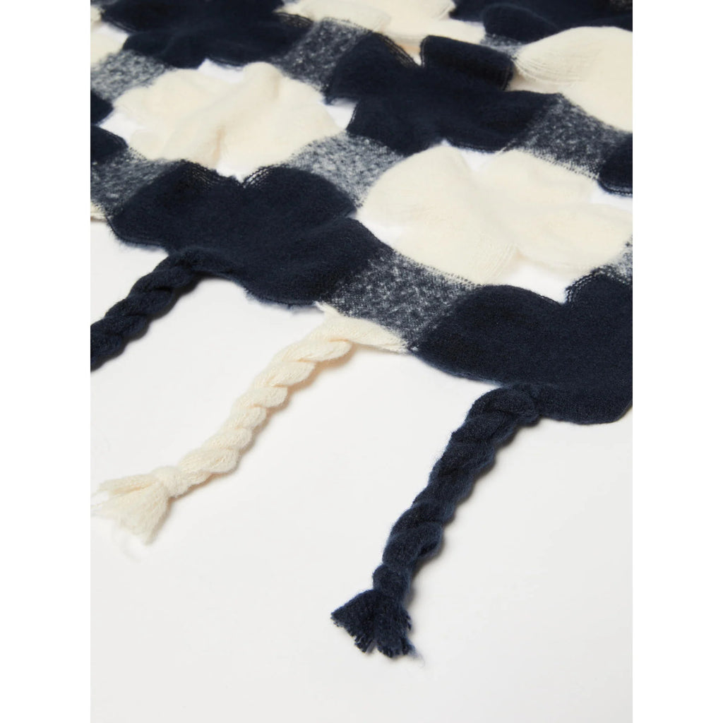 This striking scarf combines warmth with modern design, featuring an openwork chequer pattern in deep navy tones. Generously sized, it drapes beautifully over outerwear or can be wrapped for cosy layering. Finished with woven fringes, it’s the perfect accent piece for elevating everyday looks.
