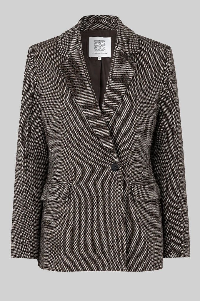 Second Female tailored tweed blazer. The blazer is made in a wool-blend fabric with tweed woven pattern. Featuring a notch lapel and off-centre button fastening. Padded shoulders and long sleeves with stitching details and slits at cuffs. Two flap pockets and slit at back. Fully lined. Slim and contoured fit.