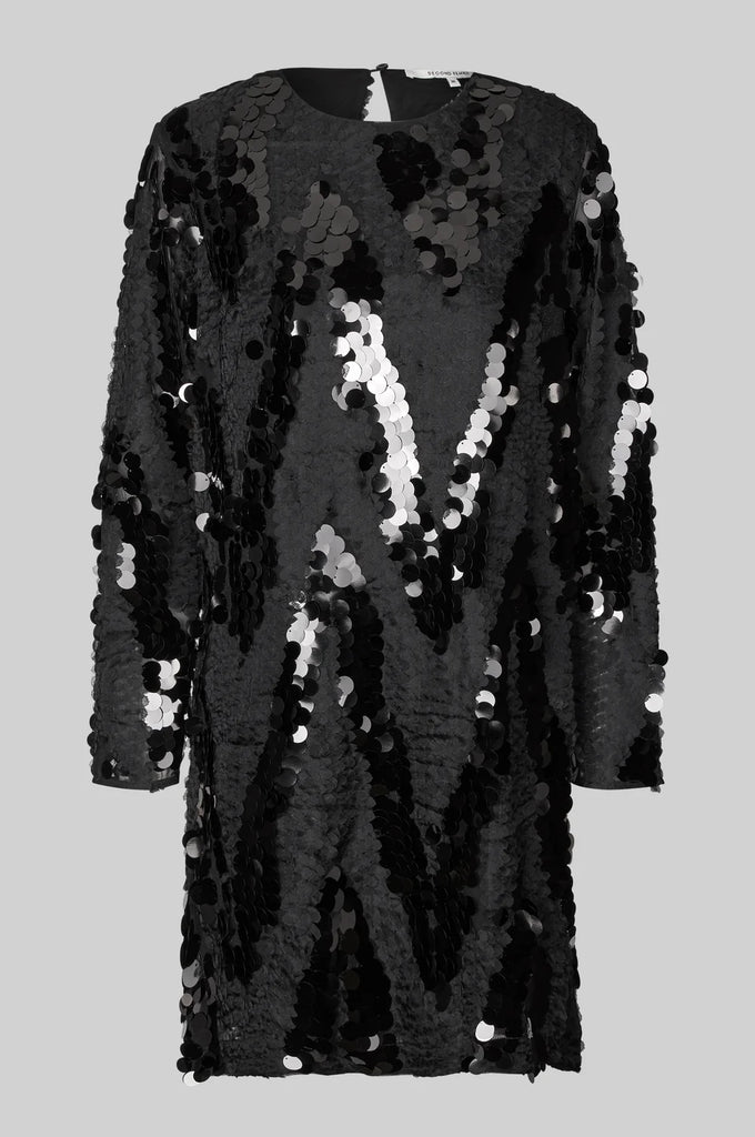 Second Female sequin dress. The dress combines sparkly sequins and sheer 3D fabric on a tonal mesh background. Featuring a round neck and keyhole opening with button fastening at the back. Shoulder pads and long sleeves. Lined body. Straight fit.