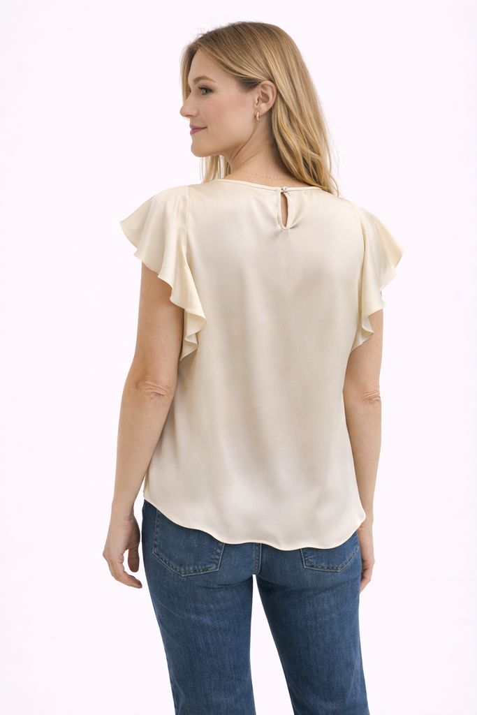 • Flutter sleeves with subtle ruffle detailing